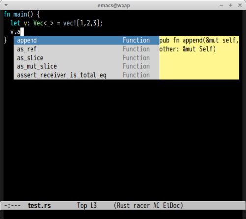 Repository https://github.com/syohex/emacs-ac-racer How to use Install rust(https://www.rust-lang.org/install.html) Install racer(https://github.com/phildawes/racer) (defun my/racer-mode-hook () (ac-racer-setup)) (add-hook 'racer-mode-hook…